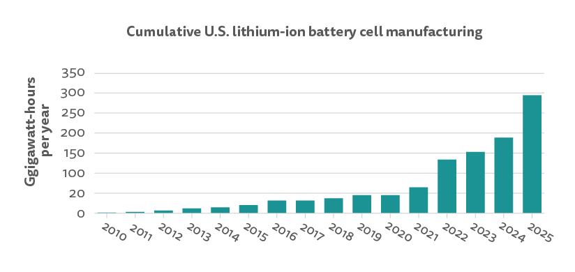 - By the end of 2025, the United States had 295 gigawatt-hours (GWh) of annual lithium-ion battery manufacturing capacity, a 56% increase year-on-year.