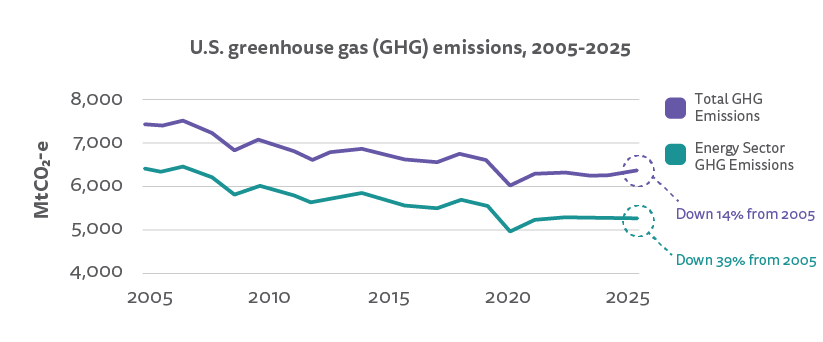 - U.S. economy-wide greenhouse gas emissions rose 1.7% in 2025 but have fallen 5.4% over the past decade. Emissions in 2025 were 14% below 2005 levels.