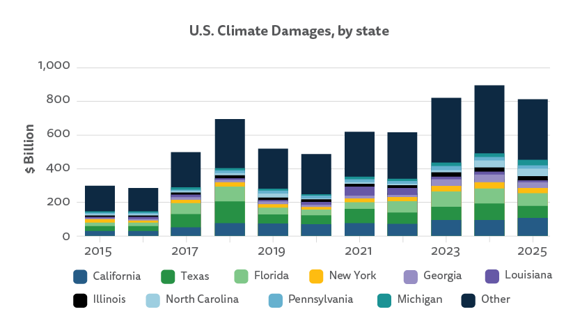 The U.S. financial costs of climate change reached $800 billion in 2025, equivalent to 2.6% of GDP.