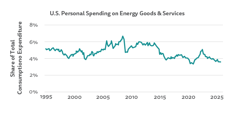 - The 2026 Factbook reports that total consumer spending on energy as a share of personal expenditures fell 0.2 percentage points year-over-year, to 3.66%. On average, 2025 gasoline prices were lower than in 2024.