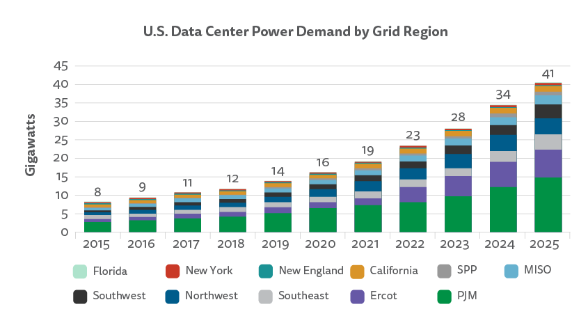 - Data centers are now a dominant force behind rising U.S. power demand and the associated impact on the grid. Data center electricity demand has quintupled in the past 10 years and grown 150% in the last five years.