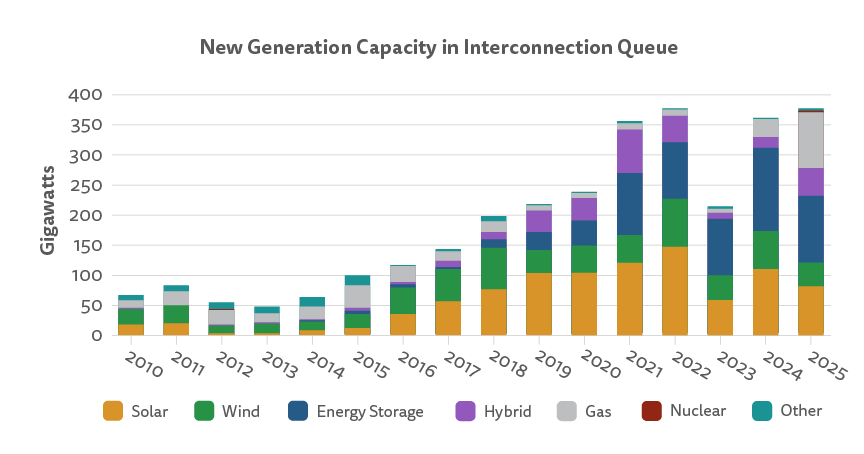 - In 2025 alone, 377 GW of new capacity applied to interconnect in the seven U.S. independent system operators, with energy storage projects making up the majority. It can take years for these projects to connect to the grid and bring power online.
