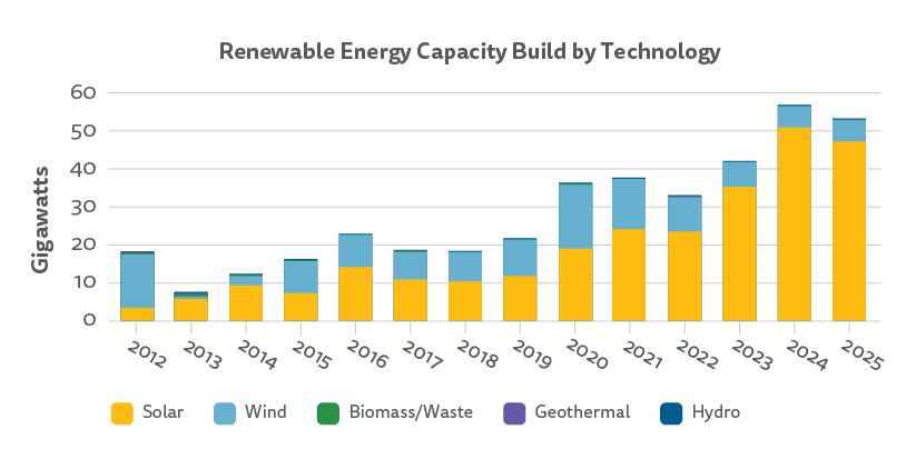 - New biomass, geothermal and small hydropower build also grew, but at lower levels.